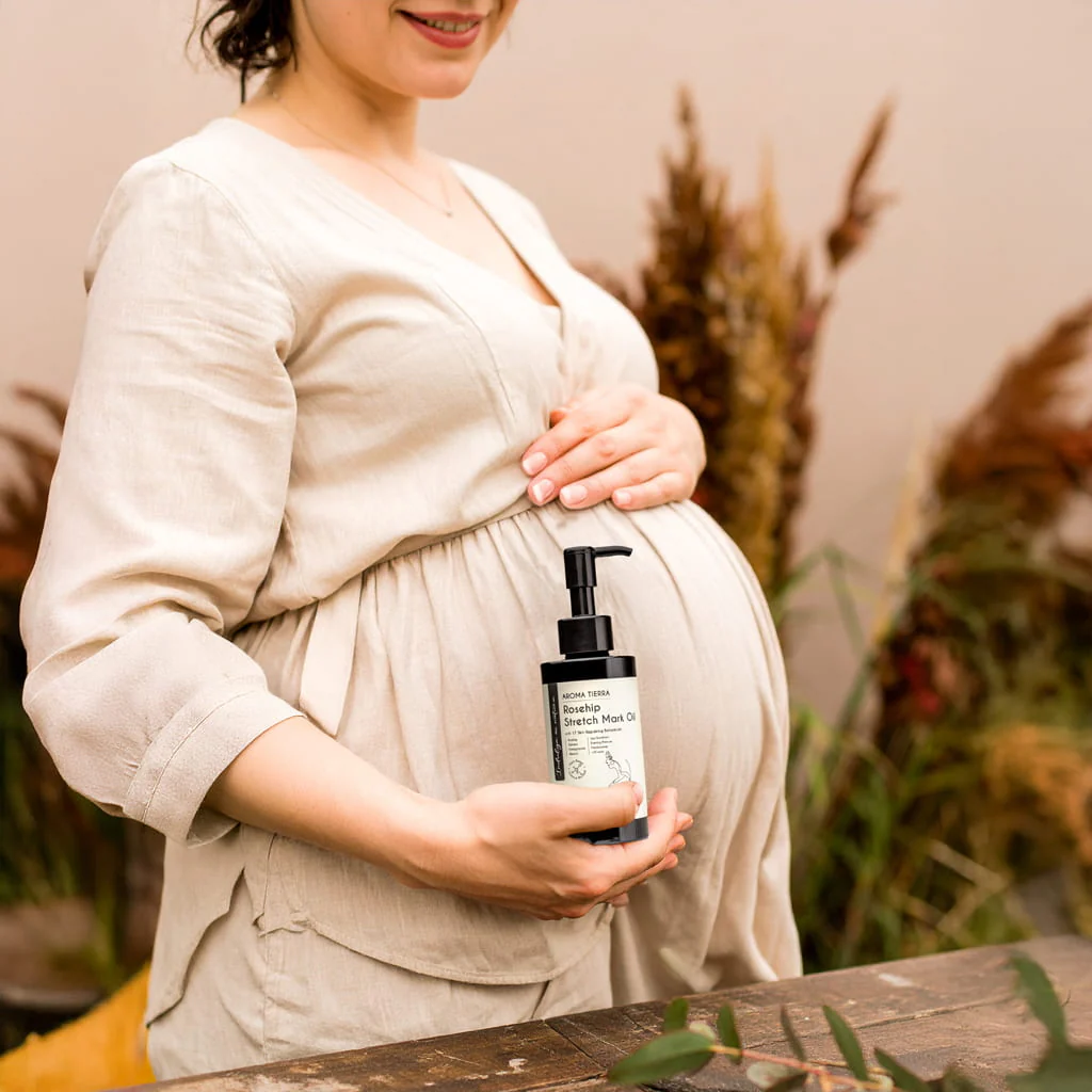 Aroma Tierra Rosehip Stretch Mark Oil is expertly formulated with potent emollient, skin-repairing, and skin-regenerating botanicals to help improve elasticity and naturally prevent the appearance of stretch marks, and repair stretch marks. Rich in vitamin E, carotenoids, neo-flavonoids, omega 7, omega 5, and other phytonutrients, the Stretch Mark Oil heals the skin from within by speeding up cellular regeneration, providing ample nutrition, and boosting elasticity. Use this all-natural plant-based formula without worrying about harsh chemicals and toxins. The gentle aroma of patchouli and geranium essential oils will relax you and make this ritual a pleasurable experience.