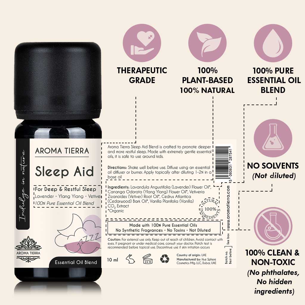 Aroma Tierra Sleep Aid Essential Oil Blend is expertly crafted to promote deeper and more restful sleep. This calming blend features gentle, kid-safe essential oils known to relax the mind and body, making it easier to fall asleep - and stay asleep - through the night. With its soothing aroma, Sleep Aid creates a serene bedtime atmosphere that melts away restlessness and invites peaceful slumber. Diffuse in your bedroom, add to a warm bath, or dilute for a relaxing pre-sleep massage. Check out Aroma Tierra Sleep Aid Roll-on, ready for direct topical application, and Aroma Tierra Sleep Aid Body Oil for a deeply relaxing massage to promote restful sleep.